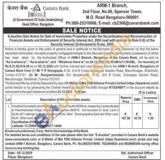 Industrial Converted Land having Sy No. 42/2 old Sy. No 9/8 Block, measuring 2 acres situated at Pandithanahalli Village, Kasaba hobli, Tumkur-560070, and bounded on: East: Land in Sy.No 42/1 belongs to KV Nagesh and others, West Devarayapatna Gadi and Other Land, North: Other Land, South: Road Coordinates of the property Latitude-13.33904, Longitude 77.14659