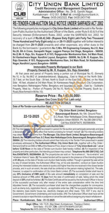 All that piece and parcel of Property being a portion out of Municipal No. 10, (formerly No.10, in Sy. No.96/2 of Jarakabandekaval). Measuring East to West on the North Side 35.7 feet on the South Side: 39 feet, North to South on the East Side 26 feet, on the West Side: 40 feet, situated at 3rd Main Road, Sn Kanteswara Nagar. Bengaluru City Corporation. now Bengaluru Mahanagara Palike, Bengaluru and bounded as under; East by: Subbiahs Property, West by Portion of Property Old No.10, North by Private Property, South by: Road, (Now formed in M.No. 10)