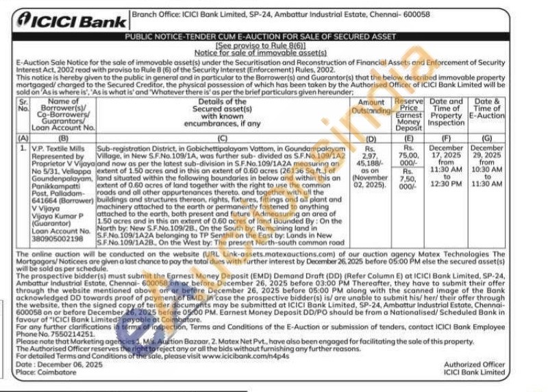 Sub-registration District, in Gobichettipalayam Vattom, in Goundampalayam Village, in New S.F.No.109/1A, was further sub-divided as S.F.No.109/1A2 and now as per the latest sub- sub-division in S.F.No.109/1A2A measuring an extent of 1.50 acres and in this an extent of 0.60 acres (26136 Sq.ft. of land situated within the following boundaries in below and within this an extent of 0.60 acres of land together with the right to use the common roads and all other appurtenances thereto, and together with all the buildings and structures thereon, rights, fixtures, fittings and all plant and machinery attached to the earth or permanently fastened to anything attached to the earth, both present and future (Admeasuring an area of 1.50 acres and in this an extent of 0.60 acres of land Bounded By: On the North by: New SF.No. 109/28, On the South by: Remaining land in S.F.No. 109/1A2A belonging to TP Senthil on the East by: Lands in New S.F.No.109/1A2B., On the West by: The present North-south common road