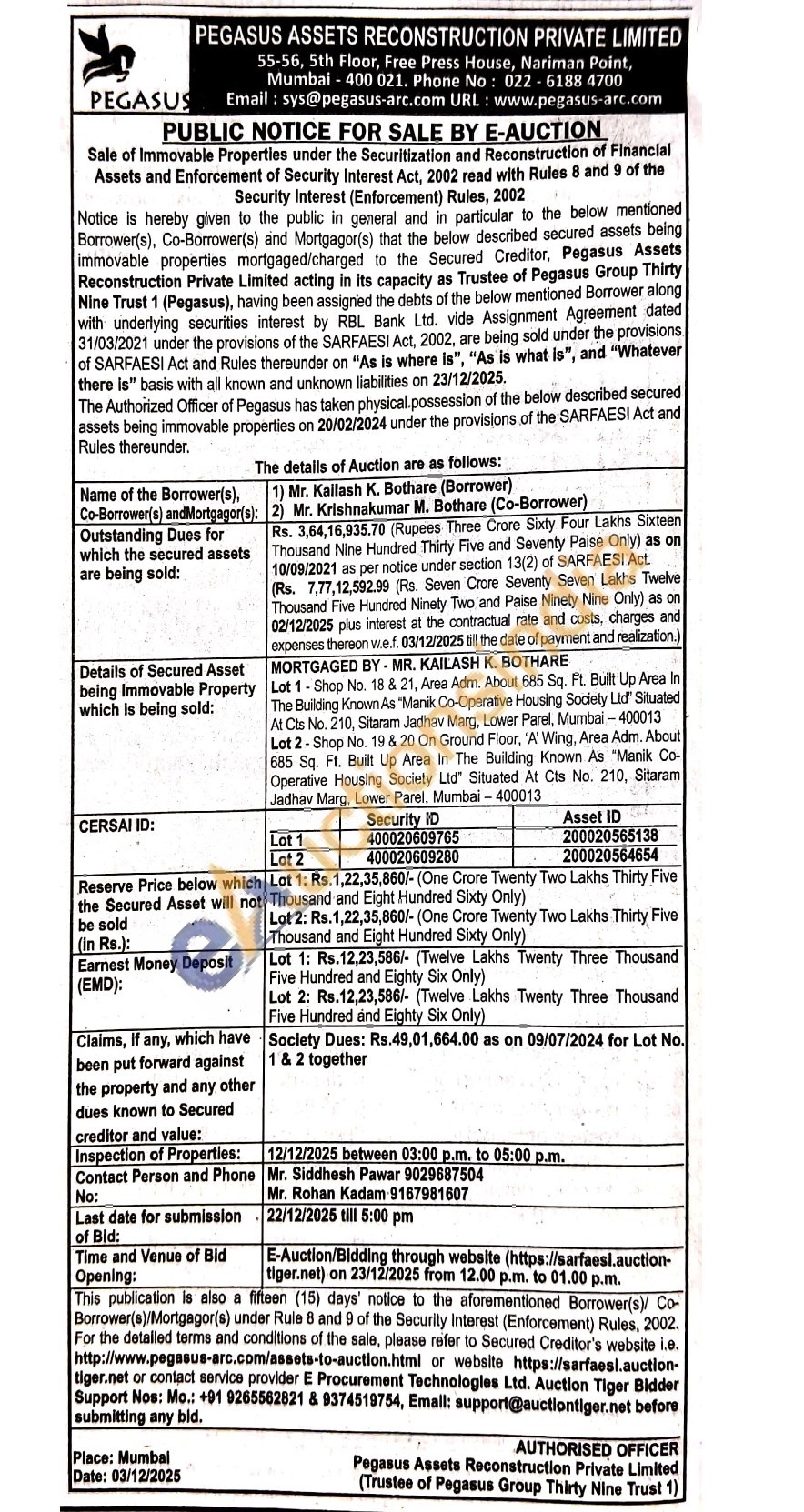 MORTGAGED BY MR. KAILASH K. BOTHARE Lot 1 Shop No. 18 & 21, Area Adm. About 685 Sq. Ft. Built Up Area In The Building Known As "Manik Co-Operative Housing Society Ltd Situated At Cts No. 210, Sitaram Jadhav Marg, Lower Parel, Mumbai-400013