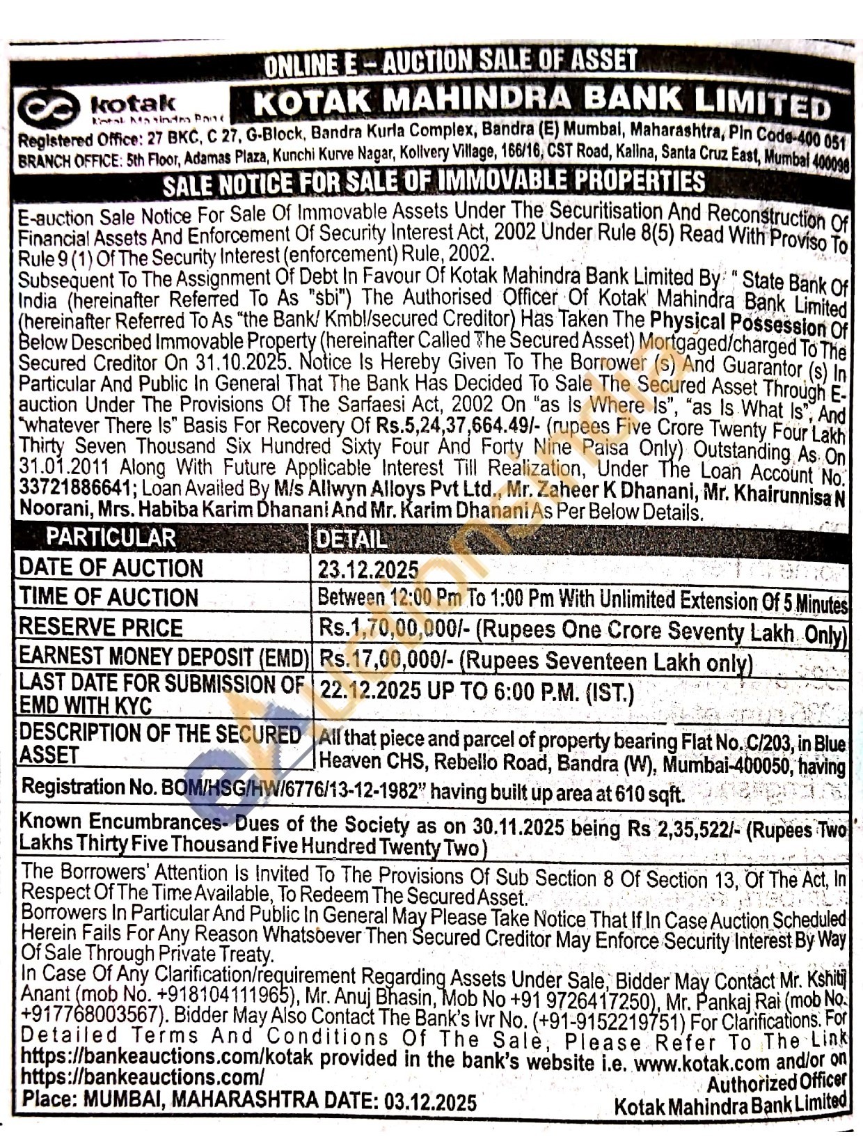 All that piece and parcel of property bearing Flat No. C/203, in Blue Heaven CHS, Rebello Road, Bandra (W), Mumbai-400050, having Registration No. BOM/HSG/HW/6776/13-12-1982" having built up area at 610 sqft.