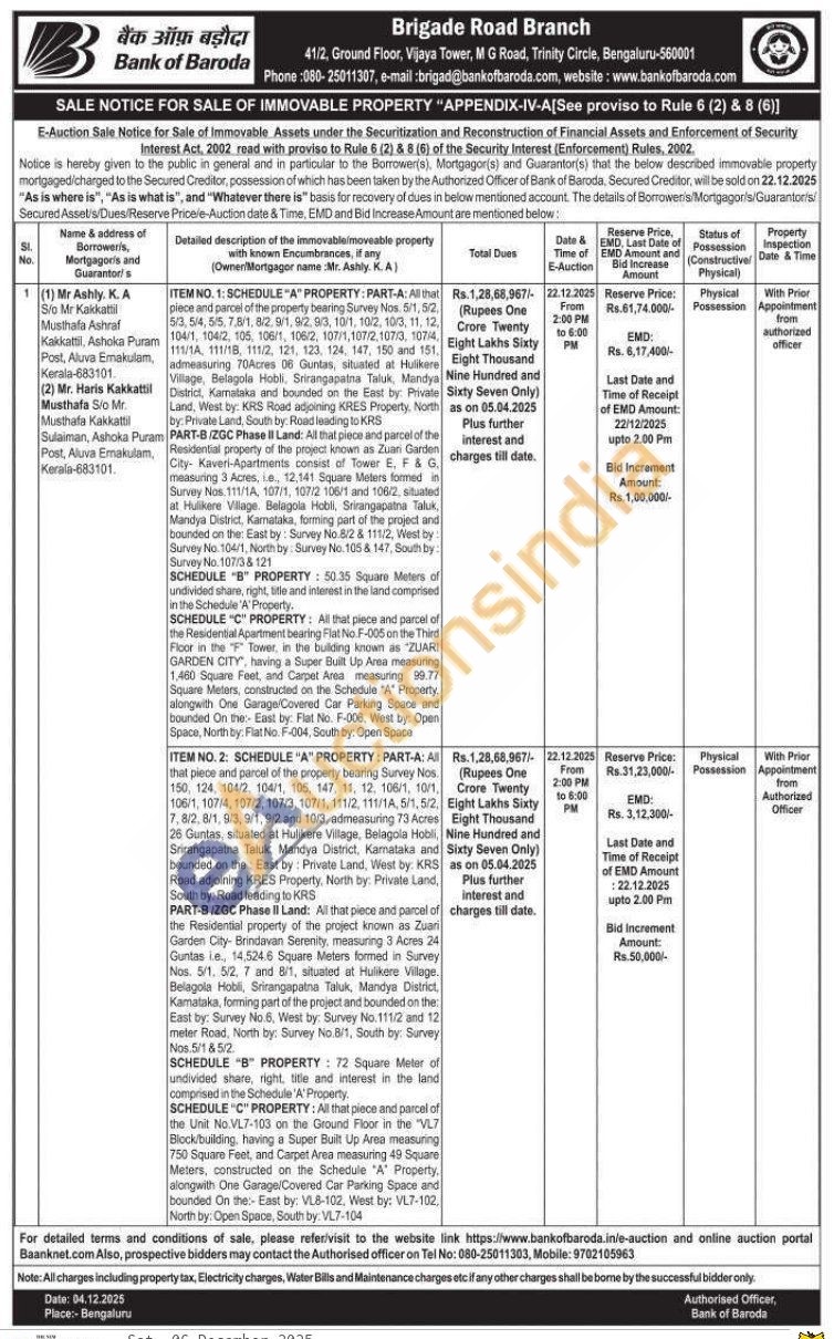 ITEM NO. 1: SCHEDULE A" PROPERTY: PART-A: Al that plece and parcel of the property bearing Survey Nos. 5/1, 5/2 5/3, 5/4, 5/5,7,8/1, 62, 9/1, 9/2, 93, 10/1, 10/2, 103, 11, 12, 104/1, 104/2, 105, 106/1, 106/2, 107/1,107/2, 107/3, 1074, 111/1A, 111/18, 111/2, 121, 123, 124, 147, 150 and 151, admeasuring 70Acres D6 Guntes, situated at Hulikere Village, Belagola Hobli, Srirangapatna Taluk, Mandya District, Kamolała and bounded on the East by Private Land, West by: KRS Road adjoining KRES Property, North by: Private Land, South by: Road leading to KRS PART-B/ZGC Phase II Land: At that piece and parcel of the Residential property of the project known as Zuan Garden City Kaveri-Apartments consist of Tower E, F &G measuring 3 Acres, a, 12,141 Square Molers formed in Survey Nos. 111/14, 107/1, 10712 106/1 and 106/2, situated at Hulikere Village. Belagoia Hobli, Srirangapatna Taluk, Mandya District, Kamataka, forming part of the project and bounded on the East by: Survey No.82 & 111/2, West by: Survey No.104/1, North by Survey No. 105-8 147, South by: Survey No. 107/3 & 121 SCHEDULE "B" PROPERTY: 50.35 Square Meters of undivided share, right, title and interest in the land comprised in the Schedule 'A' Property. SCHEDULE "C" PROPERTY: Al that place and parcel of the Residental Apartment bearing Flat No. F-005 on the Third Floot in the Tower, in the building known as "ZUARI GARDEN CITY, having a Super Built Up Area measuring 1,460 Square Feet, and Carpel Area measuring 99.77 Square Meters, constructed on the Schedule "A" Property, alongwith One Garage/Covered Car Parking Space and bourided On the East by: Flat No. F-008, West by: Open Space, North by: Flat No. F-004, South by: Open Space