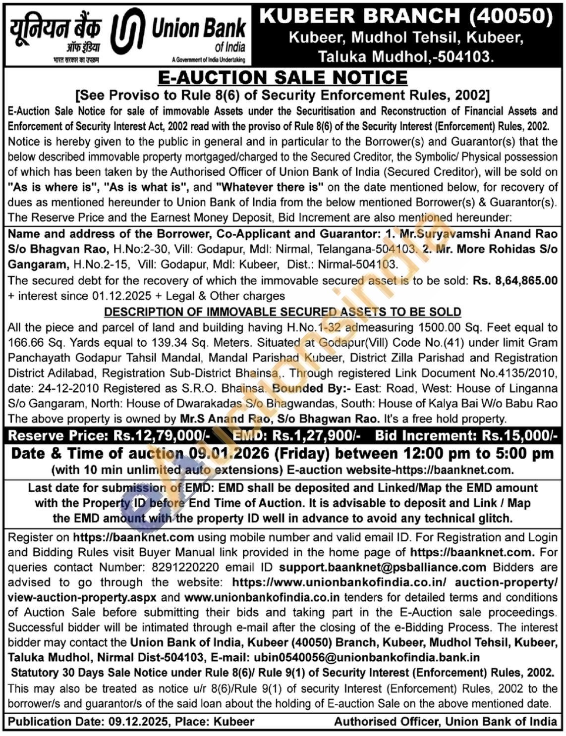 All the piece and parcel of land and building having H.No.1-32 admeasuring 1500.00 Sq. Feet equal to 166.66 Sq. Yards equal to 139.34 Sq. Meters. Situated at Godapur(Vill) Code No. (41) under limit Gram Panchayath Godapur Tahsil Mandal, Mandal Parishad Kubeer, District Zilla Parishad and Registration District Adilabad, Registration Sub-District Bhainsa,. Through registered Link Document No.4135/2010, date: 24-12-2010 Registered as S.R.O. Bhainsa. Bounded By:- East: Road, West: House of Linganna S/o Gangaram, North: House of Dwarakadas S/o Bhagwandas, South: House of Kalya Bai W/o Babu Rao The above property is owned by Mr.S Anand Rao, S/o Bhagwan Rao. It's a free hold property.