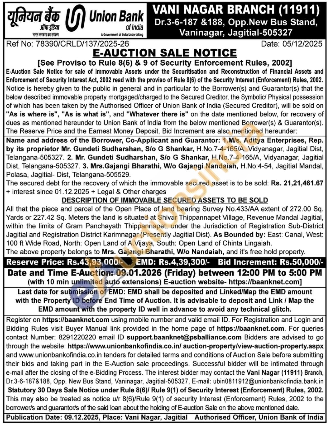 All that the piece and parcel of the Open Place of land bearing Survey No.433/AA extent of 272.00 Sq. Yards or 227.42 Sq. Meters the land is situated at Shivar Thippannapet Village, Revenue Mandal Jagitial, within the limits of Gram Panchayath Thippannapet, under the Jurisdiction of Registration Sub-District Jagitial and Registration District Karimnagar (Presently Jagitial Dist). As Bounded by: East: Canal, West: 100 ft Wide Road, North: Open Land of A.Vijaya, South: Open Land of Chinta Lingaiah.