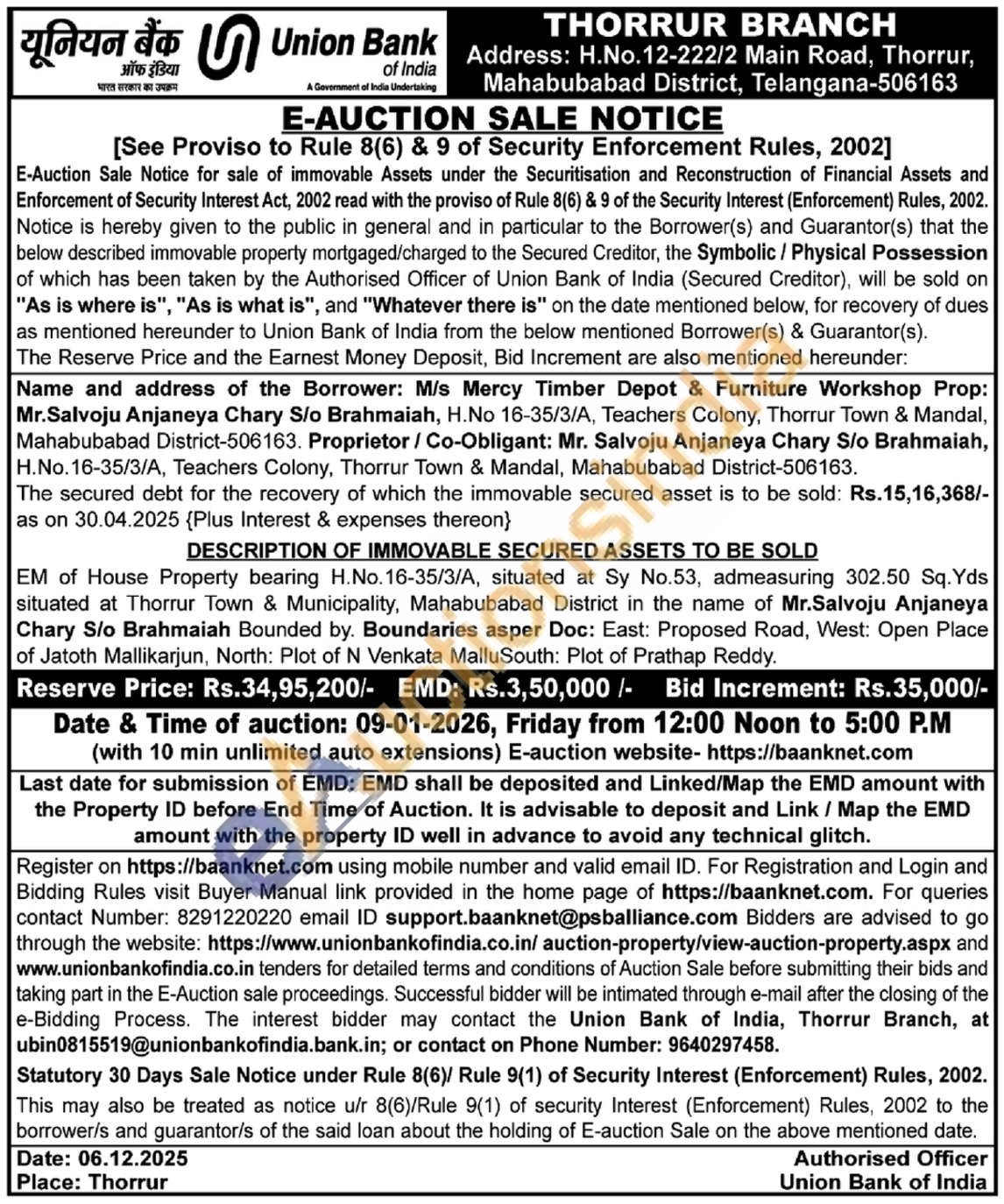 EM of House Property bearing H.No. 16-35/3/A, situated at Sy No.53, admeasuring 302.50 Sq. Yds situated at Thorrur Town & Municipality, Mahabubabad District in the name of Mr.Salvoju Anjaneya Chary S/o Brahmaiah Bounded by. Boundaries asper Doc: East: Proposed Road, West: Open Place of Jatoth Mallikarjun, North: Plot of N Venkata MalluSouth: Plot of Prathap Reddy.