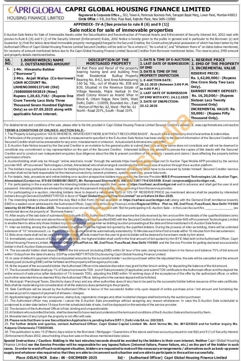 All that Piece and Parcel of the property bearing having land and building Free Hold Residential Builtup Property Bearing No. B-62, land Area Admeasuring 160 Sq. Yds, out of Khasra No. 838 and 839, Situated in the Revenue Estate of abadi Colony Known as Anand Vihar in Thar in Village Nawada, Majra Hastsal In the Block B, Uttam Nagar, New Delhi, West Delhi, Delhi-110059, Bounded As, East North-Road 20 Ft., South-Road 10 Ft. -Portion of Plot No. 62, West-Plot No. 61