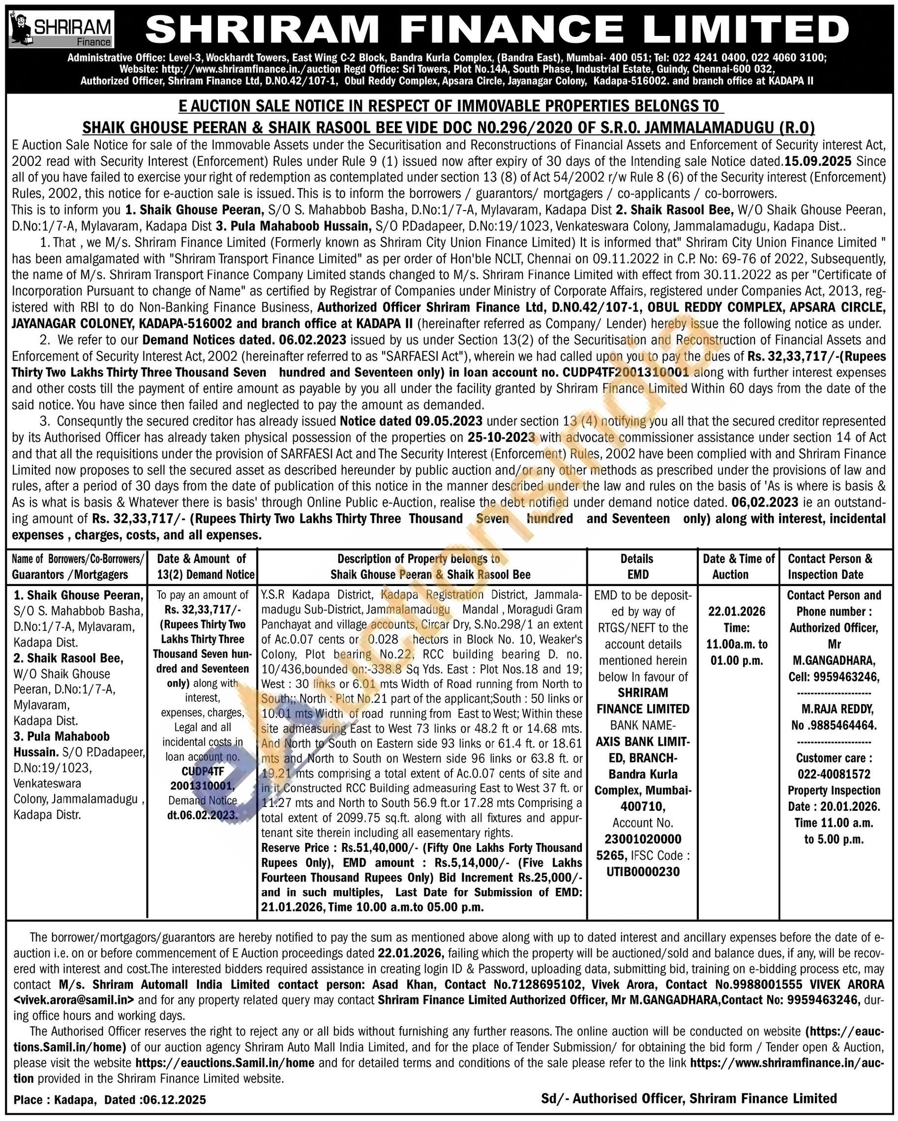 Y.S.R Kadapa District, Kadapa Registration District, Jammala-madugu Sub-District, Jammalamadugu Mandal, Moragudi Gram Panchayat and village accounts, Circar Dry, S.No.298/1 an extent of Ac.0.07 cents or 0.028 hectors in Block No. 10. Weaker's Colony, Plot bearing No.22, RCC building bearing D. no. 10/436,bounded on:-338.8 Sq Yds. East: Plot Nos. 18 and 19; West: 30 links or 6.01 mts Width of Road running from North to South:: North: Plot No.21 part of the applicant: South: 50 links or 10.01 mts Width of road running from East to West; Within these site admeasuring East to West 73 links or 48.2 ft or 14.68 mts. And North to South on Eastern side 93 links or 61.4 ft. or 18.61 mts and North to South on Western side 96 links or 63.8 ft. or 19.21 mts comprising a total extent of Ac.0.07 cents of site and in it Constructed RCC Building admeasuring East to West 37 ft. or 11.27 mts and North to South 56.9 ft.or 17.28 mts Comprising a total extent of 2099.75 sq.ft. along with all fixtures and appur-tenant site therein including all easementary rights
