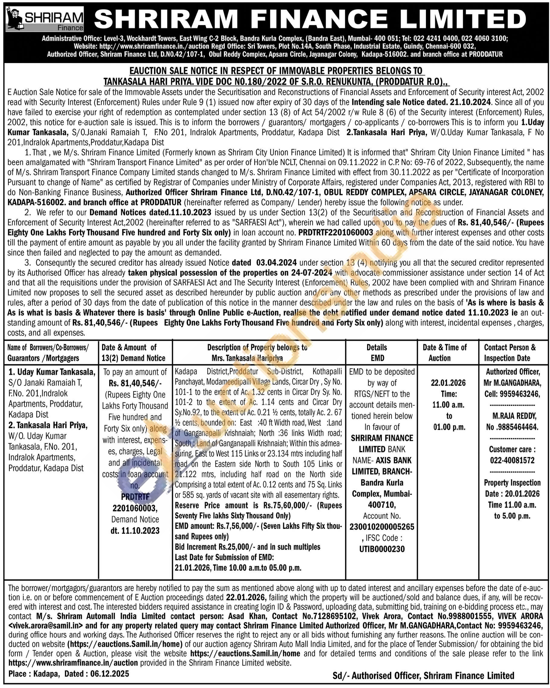 Kadapa District, Proddatur Sub-District, Kothapalli Panchayat, Modameedipalli Village Lands, Circar Dry, Sy No. 101-1 to the extent of Ac. 1.32 cents in Circar Dry Sy. No. 101-2 to the extent of Ac. 1.14 cents and Circar Dry Sy.No.92, to the extent of Ac. 0.21 ½ cents, totally Ac. 2. 67 ½ cents, bounded on: East :40 ft Width road, West Land of Ganganapalli Krishnaiah; North :36 links Width road; South: Land of Ganganapalli Krishnaiah; Within this admea-suring, East to West 115 Links or 23.134 mtrs including half road on the Eastern side North to South 105 Links or 21.122 mtrs, including half road on the North side Comprising a total extent of Ac. 0.12 cents and 75 Sq. Links or 585 sq. yards of vacant site with all easementary rights. Reserve Price amount is Rs.75,60,000/- (Rupees Seventy Five lakhs Sixty Thousand Only