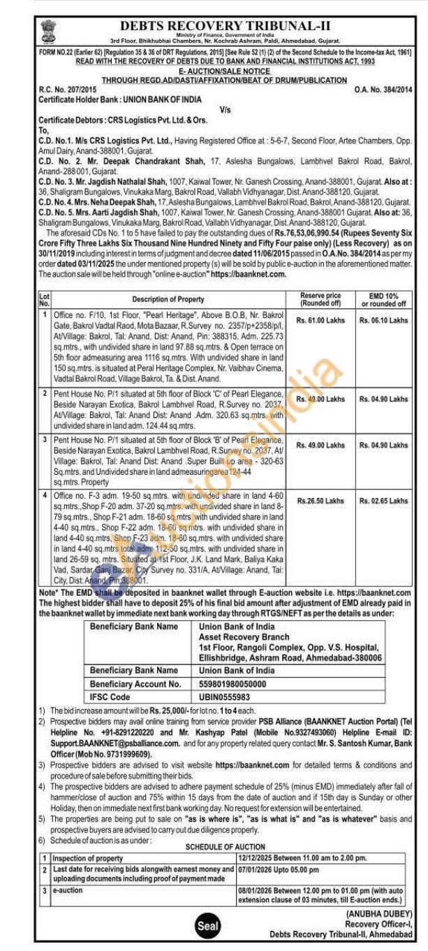 Pent House No. P/1 situated at 5th floor of Block 'B' of Pearl Elegance, Beside Narayan Exotica, Bakrol Lambhvel Road, R.Survey no. 2037, At/Village: Bakrol, Tal: Anand Dist: Anand Super Built up area 320-63 Sq.mtrs. and Undivided share in land admeasuringarea 124-44 sq.mtrs. Property