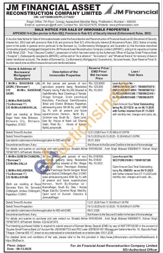 All that pieces and parcels of non-agriculture property being Residential Property having situated at Rio Village-Nayawas Gram Panchayat Bolonka Sanwta Panchayat Samiti Gangrar Tehsil Gangrar District Chittorgarh (Raj.) 312901 (area admeasuring area 1694 Sq. ft.) with all present and future superstructure thereon. North By:Shankar lal khemaRegar, South By: Dalu / Nanda Regar, East By: Common Road, West By: Open land of Suresh Chandra & JamnalalRegar.