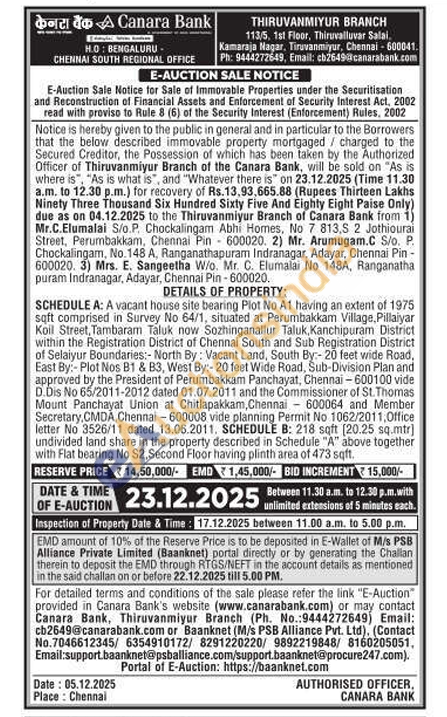 A vacant house site bearing Plot No A1 having an extent of 1975 sqft comprised in Survey No 64/1, situated at Perumbakkam Village, Pillaiyar Koil Street, Tambaram Taluk now Sozhinganallur Taluk, Kanchipuram District within the Registration District of Chennai South and Sub Registration District of Selaiyur Boundaries:- North By: Vacant Land, South By:-20 feet wide Road, East By:-Plot Nos B1 & B3, West By:-20 feet Wide Road, Sub-Division Plan and approved by the President of Perumbakkam Panchayat, Chennai-600100 vide D.Dis No 65/2011-2012 dated 01.07.2011 and the Commissioner of St. Thomas Mount Panchayat Union at Chitlapakkam, Chennai 600064 and Member Secretary, CMDA, Chennai-600008 vide planning Permit No 1062/2011,Office letter No 3526/11 dated 13.06.2011. SCHEDULE B: 218 sqft (20.25 sq.mtr] undivided land share in the property described in Schedule "A" above together with Flat bearing No S2, Second Floor having plinth area of 473 sqft