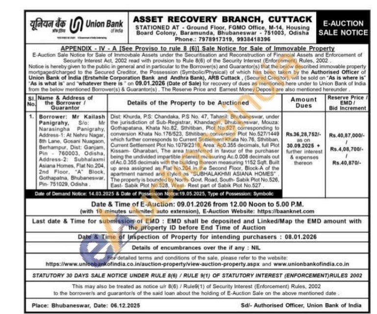 Dist: Khurda, PS: Chandaka, PS No. 47, Tahasil: Bhubaneswar, under the jurisdiction of Sub-Registrar, Khandagiri, Bhubaneswar, Mouza: Gothapatana, Khata No.82, Sthitiban, Plot No.527 corresponding to conversion Khata No. 176/523, Sthitiban, conversion Plot No.527/1449 which further corresponds to Current Settlement Khata No.76, Sthitiban, Current Settlement Plot No. 1079/2318, Area: Ac0.355 decimals, full Plot Kissam- Gharabari, The area transferred in favour of the purchaser being the undivided impartible interest measuring Ac. 0.008 decimals out of Ac.0.355 decimals with the building thereon measuring 1152 Sqft. Built up area assigned as Flat No.204 in the Second Floor, Block A of the apartment named and styled as "SUBHALAKHMI ASIANA HOMES The property is bounded by North- Govt. Road, South- Sabik Plot No. 526. East-Sabik Plot No.528, West- Rest part of Sabik Plot No.527
