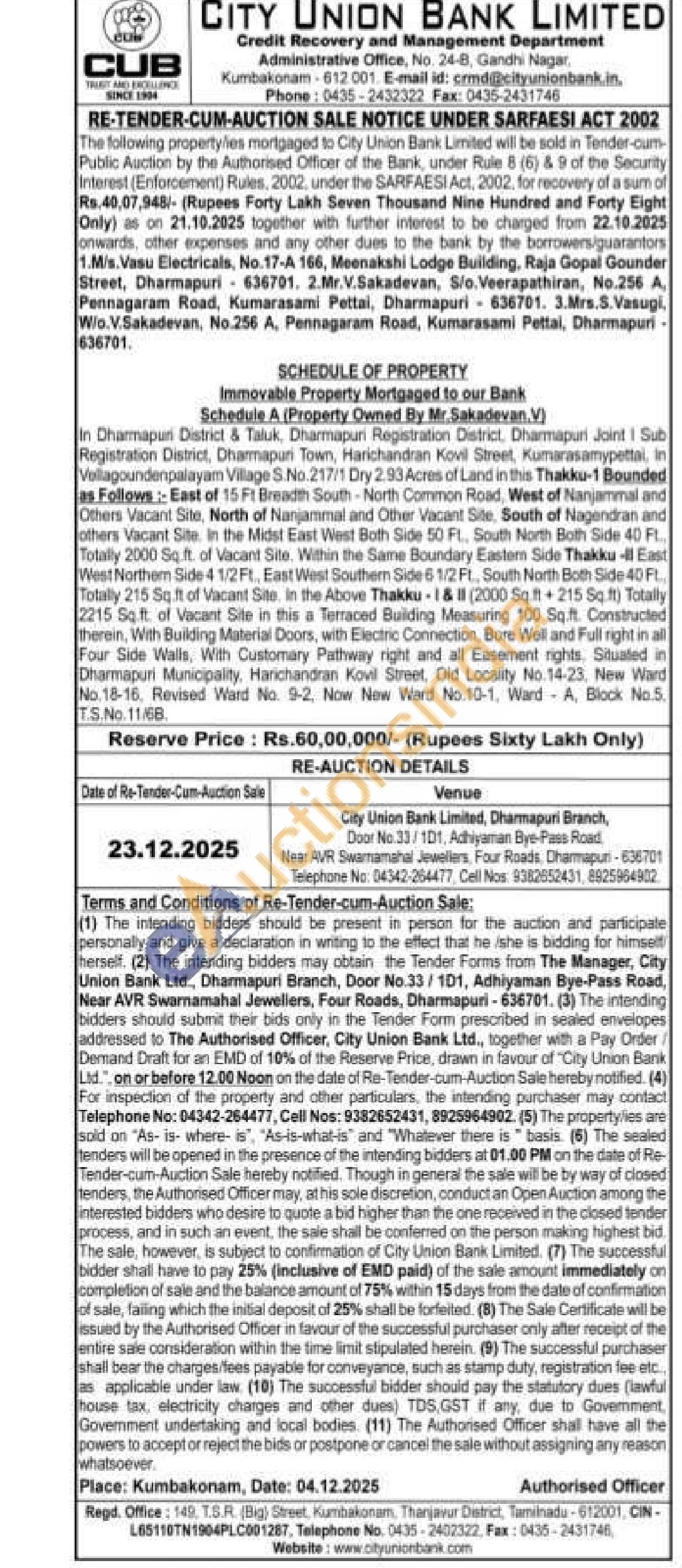 In Dharmapuri District & Taluk. Dharmapuri Registration District, Dharmapuri Joint 1 Sub Registration District, Dharmapuri Town, Harichandran Kovil Street, Kumarasamypettal, in Vellagoundenpalayam Village S.No. 217/1 Dry 2.93 Acres of Land in this Thakku-1 Bounded as Follows: East of 15 Ft Breadth South-North Common Road, West of Nanjammal and Others Vacant Site, North of Nanjammal and Other Vacant Site, South of Nagendran and others Vacant Site. In the Midst East West Both Side 50 Ft, South North Both Side 40 Ft. Totally 2000 Sq ft. of Vacant Site, Within the Same Boundary Eastem Side Thakku - East West Northern Side 41/2 Ft. East West Southern Side 6 1/2 Ft, South North Both Side 40 Ft. Totally 215 Soft of Vacant Site. In the Above Thakku 1& (2000 Sqft+215 Sq.ft) Totally 2215 Sq.ft. of Vacant Site in this a Terraced Building Measuring 100 Sqft. Constructed therein, With Building Material Doors, with Electric Connection, Bore Well and Full right in all Four Side Walls, With Customary Pathway right and all Easement rights. Situated in Dharmapuri Municipality, Marichandran Kovil Street, Old Locality No.14-23, New Ward No.18-16, Revised Ward No. 9-2 Now New Ward No.10-1, Ward A. Block No.5. TS. No. 11/68