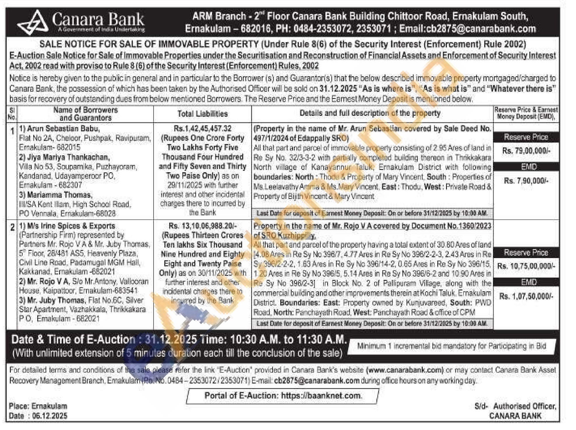 1)All that part and parcel of immovable property consisting of 2.95 Ares of land in Re Sy No. 32/3-3-2 with partially completed building thereon in Thrikkakara North village of Kanayannur Taluk, Ernakulam District with following boundaries: North: Thodu & Property of Mary Vincent, South: Properties of Ms. Leelavathy Amma & Ms. Mary Vincent, East: Thodu, West: Private Road & Property off Bijith Vincent & Mary Vincent