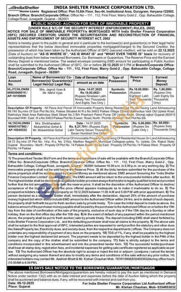 All Piece And Parcel Of Immovable Property Comprising Of Residential House On Land Admeasuring 39.72 Sq.mirs Of Plot No. 14/p, R.s. No. 216/p, Madhav Nagarbh. Municipal Collegeat-upleta, To. Upleta, Dis. Rajkot State. Gujarat Boundary:-North: Propety Of Plot No. 14 Paikee South: Road East: Property Of Plot No. 14 Paikee West: Property Of Plot No. 14 Paikee Terms and conditions: