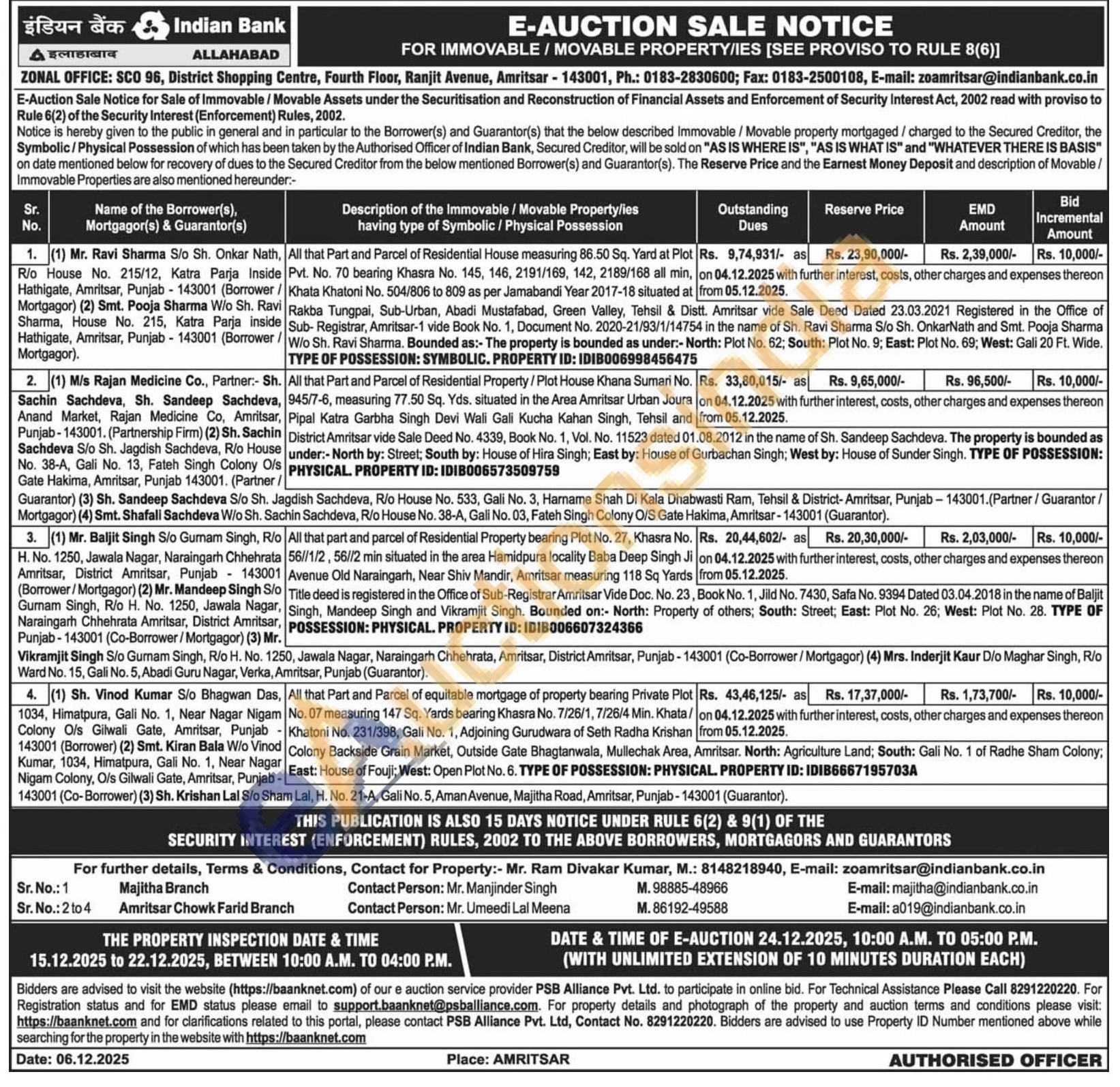 All that Part and Parcel of Residential House measuring 86.50 Sq. Yard at Plot Pvt. No. 70 bearing Khasra No. 145, 146, 2191/169, 142, 2189/168 all min, Khata Khatoni No. 504/806 to 809 as per Jamabandi Year 2017-18 situated at on 04.12.2025 with further interest, costs, other charges and expenses thereon from 05.12.2025. Ravi Rakba Tungpai, Sub-Urban, Abadi Mustafabad, Green Valley, Tehsil & Distt. Amritsar vide Sale Deed Dated 23.03.2021 Registered in the Office of Sub-Registrar, Amritsar-1 vide Book No. 1, Document No. 2020-21/93/1/14754 in the name of Sh. Ravi Sharma S/o Sh. OnkarNath and Smt. Pooja Sharma / Wio Sh. Ravi Sharma.