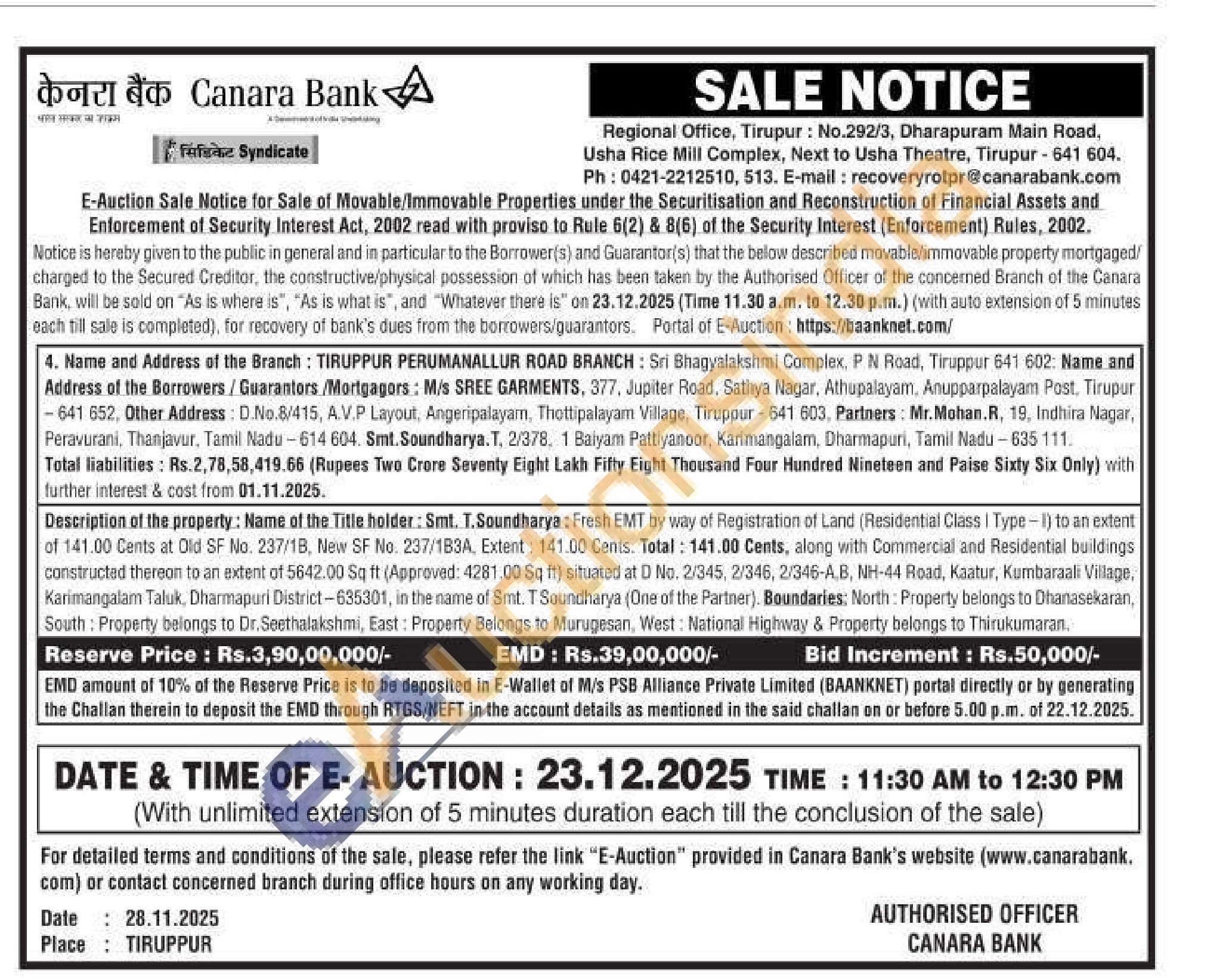 Description of the property: Name of the Title holder: Smt. T.Soundharya: Fresh EMT by way of Registration of Land (Residential Class | Type-1) to an extent of 141.00 Cents at Old SF No. 237/1B, New SF No. 237/183A, Extent: 141.00 Cents. Total: 141.00 Cents, along with Commercial and Residential buildings constructed thereon to an extent of 5642.00 Sq ft (Approved: 4281.00 Sq ft) situated at D No. 2/345, 2/346, 2/346-A.B, NH-44 Road, Kaatur, Kumbaraali Village, Karimangalam Taluk, Dharmapuri District-635301, in the name of Smt. T Soundharya (One of the Partner). Boundaries: North: Property belongs to Dhanasekaran, South: Property belongs to Dr. Seethalakshmi, East: Property Belongs to Murugesan, West: National Highway & Property belongs to Thirukumaran,