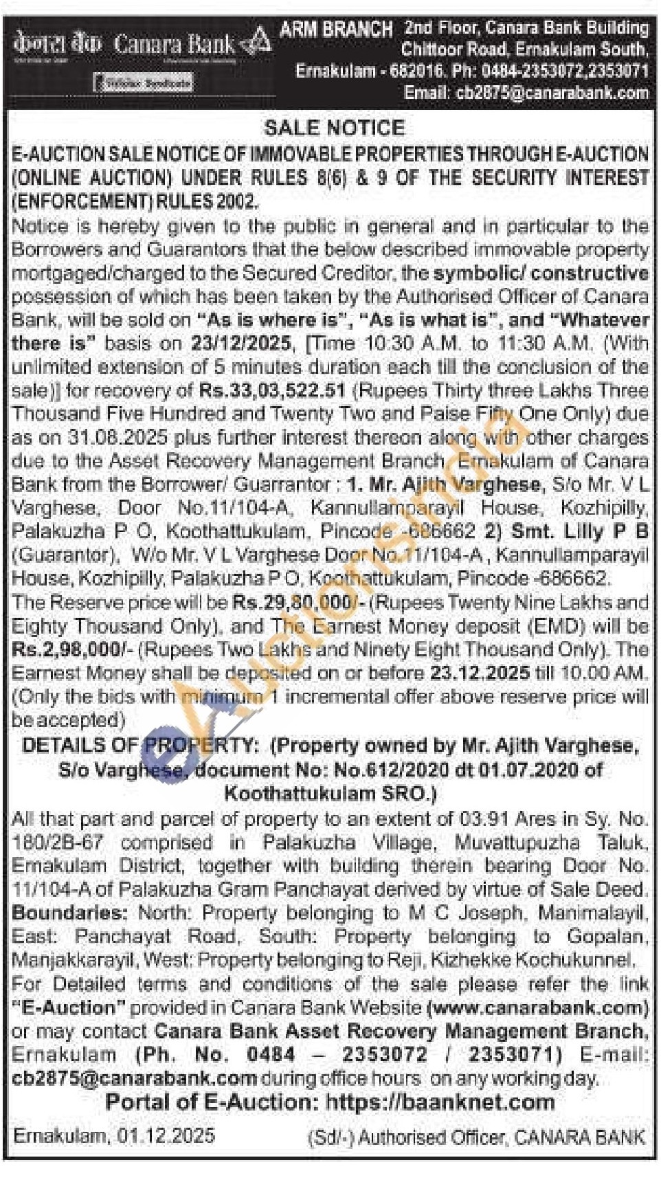 All that part and parcel of property to an extent of 03.91 Ares in Sy. No. 180/28-67 comprised in Palakuzha Village, Muvattupuzha Taluk, Ernakulam District, together with building therein bearing Door No. 11/104-A of Palakuzha Gram Panchayat derived by virtue of Sale Deed