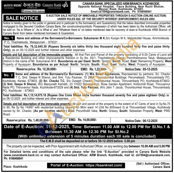 Contact Authorized Officer, ARM Branch, Kozhikode, mail id: cb7594@canarabank.com, Ph: 9188406941