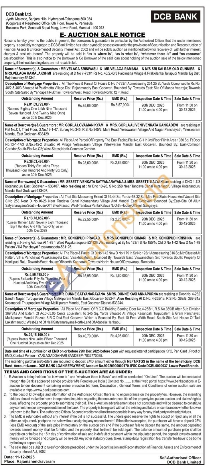 2) All Piece And Parcel Of Property The East Facing Flat No.C-1 In 3rd Floor Plinth Area 1050 Sq. Ft Door No.13-1-47/3 S.No.345-2 Situated At Village Veleswaram Village Yeleswaram Mandal East Godavari. Bounded By: East-Common Corridor, South-Plot No.C2; West-Steps; North-Common Corridor