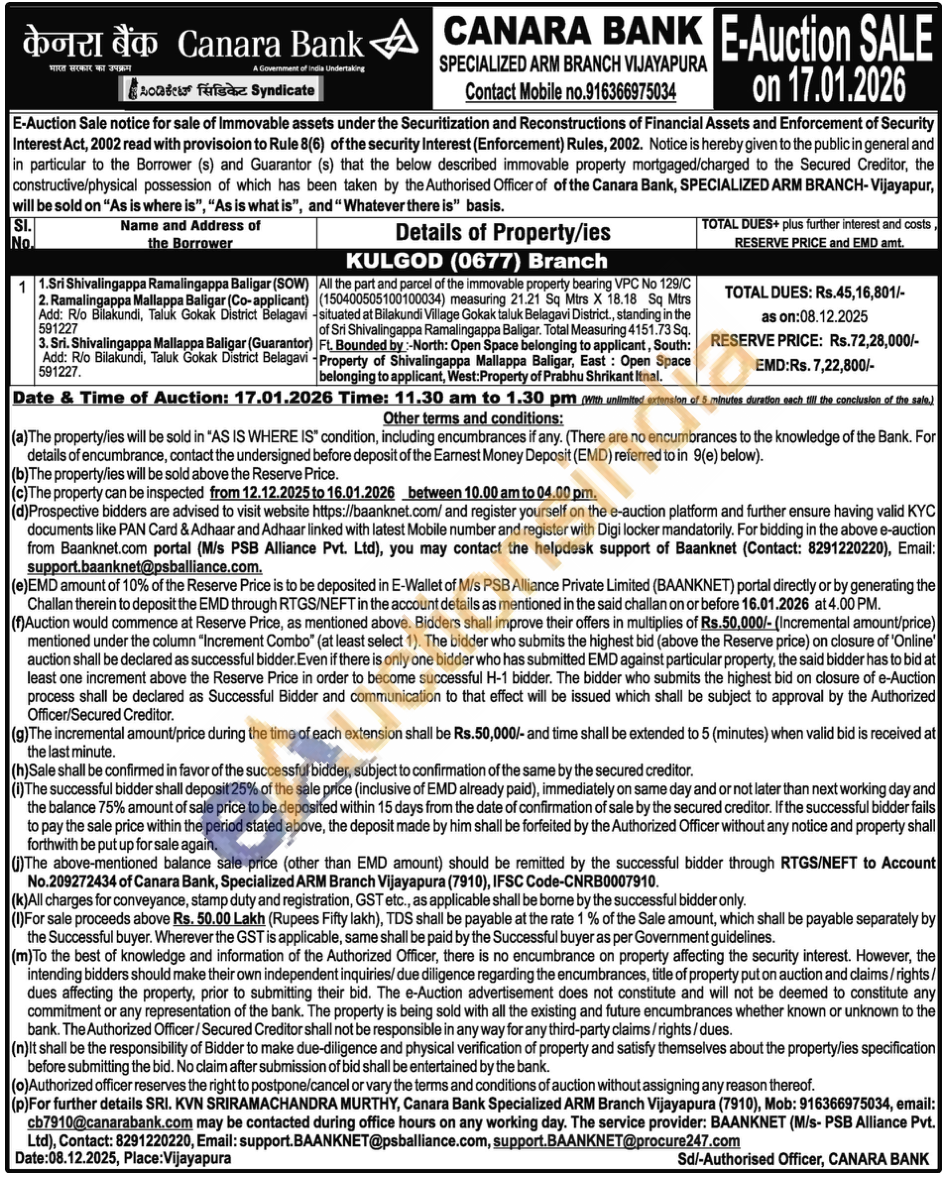 All the part and parcel of the immovable property bearing VPC No 129/C (150400505100100034) measuring 21.21 Sq Mtrs X 18.18 Sq Mtrs situated at Bilakundi Village Gokak taluk Belagavi District., standing in the of Sri Shivalingappa Ramalingappa Baligar. Total Measuring 4151.73 Sq. Ft. Bounded by:-North: Open Space belonging to applicant, South: Property of Shivalingappa Mallappa Baligar, East: Open Space belonging to applicant, West: Property of Prabhu Shrikant Itnal.