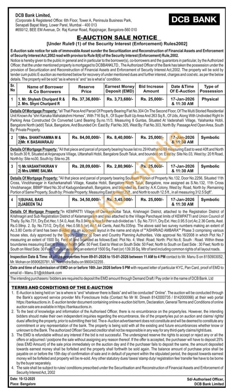 4) "In KEMPATTI Village of Denkanikottai Taluk, Krishnagiri District, attached to the Registration District of Krishnagiri and Sub Registration District of Kelamangalam and also attached to the Village Panchayat limits of KEMPATTI and Union Council of Thally. Sy. No.731, Dry. Ext. Hec. 1.54.0, Asst. Rs.0.94np is now further sub divided as 1. Sy. No. 731/1, Dry Ext. Hec.0.95.5 (or) Ac. 2.36 Cents, Asst. Rs.0.59np. 2. Sy. No.731/2, Dry.Ext. Hec.0.58.5 (or) Ac. 1.44 Cents, Asst.Rs.035np. The above said two survey numbers making an extent of Ac.3.80 Cents of land has been divided into an approved layout in the name and style of "ASHIRVAD AMBARA" Phase 3 comprising various house sites, duly approved by the Deputy Director of Town and Country Planning Authorities, Vide approval No. 16/2008 in which Plot No.7 measuring an extent of 1500 Sq. Feet of land bounded as follows: East: Plot No. 4; West Road, North: Plot No.6, South Road. Within these boundaries measuring East to West on North Side: 50 Feet: East to West on South Side: 50 Feet: North to South on East Side: 30 Feet, North to South on West Side: 30 Feet, Totally measuring an extent of 1500 Sq. Feet (or) 139.35 Sq. Mtr of land including common rights of all layout roads.