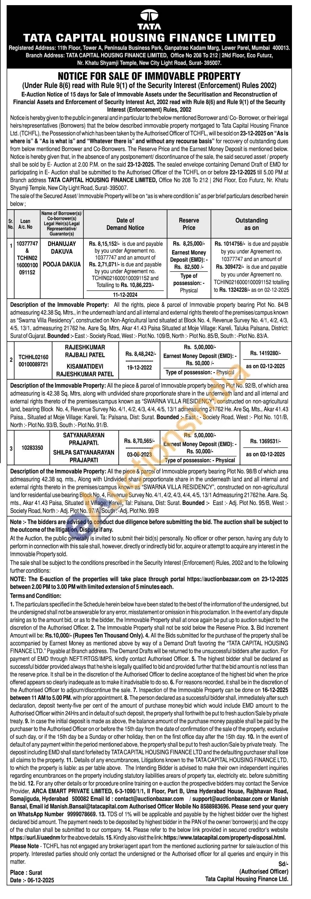 Description of the Immovable Property: All the piece & parcel of Immovable property bearing Plot No. 92/B, of which area admeasuring is 42.38 Sq. Mtrs, along with undivided share proportionate share in the underneath land and all internal and external rights thereto of the premises/campus known as "SWARNA VILLA RESIDENCY", constructed on non-agricultural land, bearing Block No. 4, Revenue Survey No. 4/1, 4/2, 4/3, 4/4, 4/5, 13/1 admeasuring 21762 He. Are Sq. Mts., Akar 41.43 Paisa., Situated at Moje Village: Kareli, Ta: Palsana, Dist: Surat. Bounded:- East: Society Road, West:- Plot No. 101/B, North:- Plot No. 93/B, South :- Plot No. 91/B.