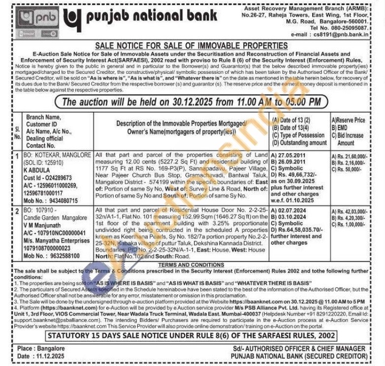 1)All that part and parcel of the properties consisting of Land measuring 12.00 cents (5227.2 Sq Ft) and residential building of 1177 Sq Ft at RS No. 169-P3(P), Sannapadavu, Pajeer Village, Near Pajeer Church Bus Stop, Gramachavadi, Bantwal Taluk, Mangalore District 574199 within the specific boundaries of: East of: Portion of same Sy No, West of: Survey Line & Road, North of: Portion of same Sy No and South of: Portion of same Sy No