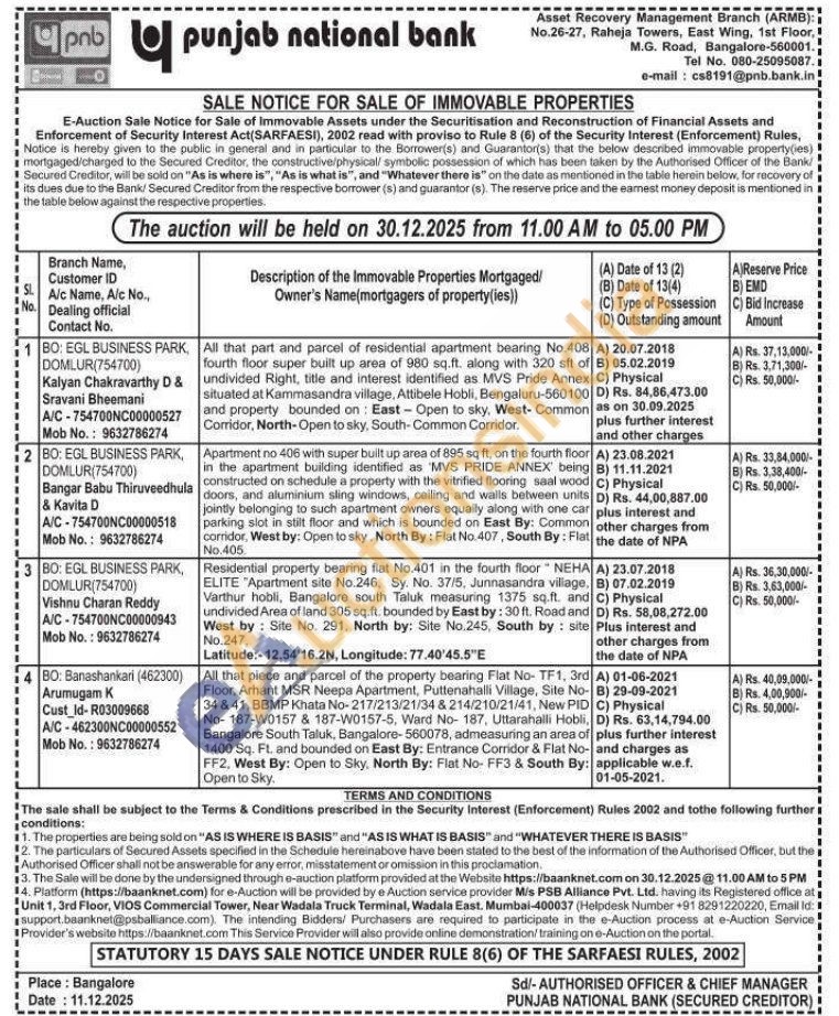 2) Apartment no 406 with super built up area of 895 sq ft, on the fourth floor in the apartment building identified as 'MVS PRIDE ANNEX' being constructed on schedule a property with the vitrified flooring saal wood doors, and aluminium sling windows, ceiling and walls between units jointly belonging to such apartment owners equally along with one car parking slot in stilt floor and which is bounded on East By: Common corridor, West by: Open to sky. North By: Flat No.407, South By: Flat No.405