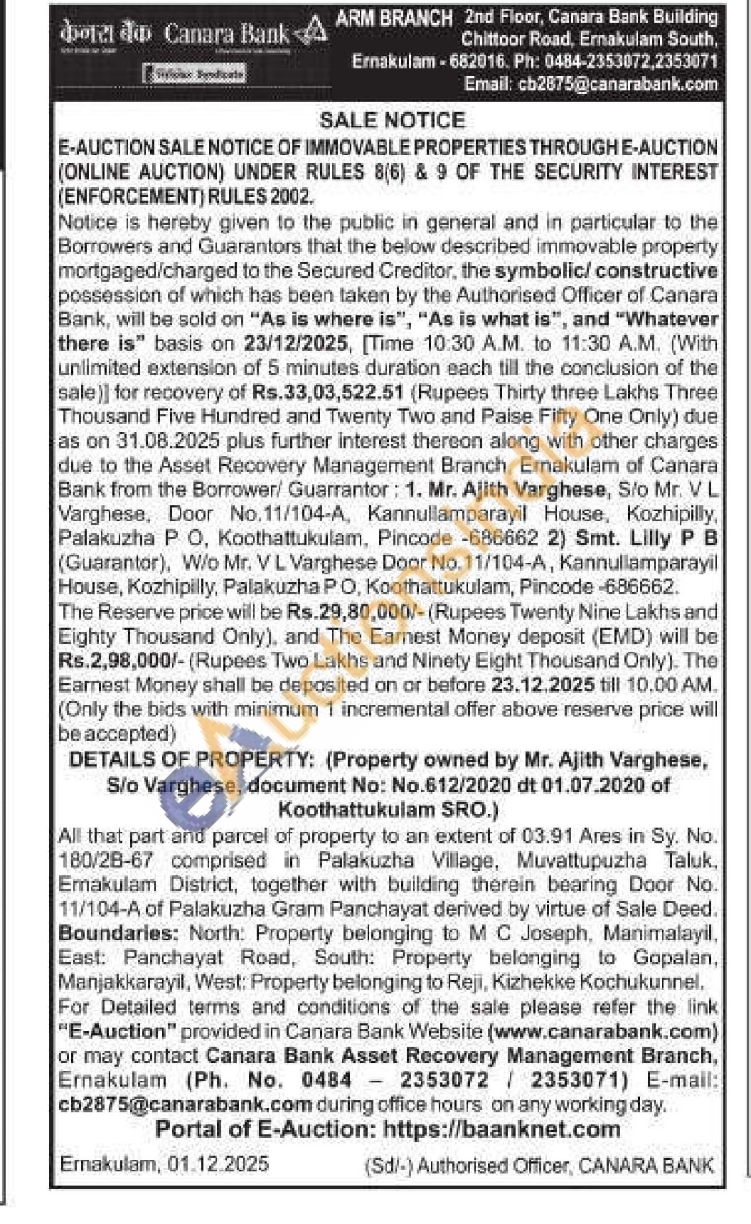 All that part and parcel of property to an extent of 03.91 Ares in Sy. No. 180/28-67 comprised in Palakuzha Village, Muvattupuzha Taluk, Ernakulam District, together with building therein bearing Door No. 11/104-A of Palakuzha Gram Panchayat derived by virtue of Sale Deed. Boundaries: North: Property belonging to MC Joseph, Manimalayil, East: Panchayat Road, South: Property belonging to Gopalan, Manjakkarayil, West: Property belonging to Reji, Kizhekke Kochukunnel.