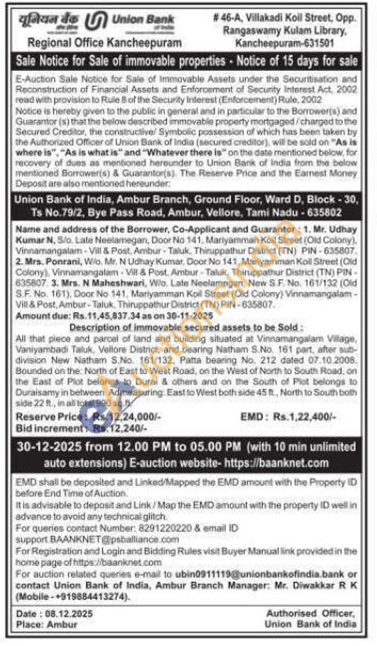 All that piece and parcel of land and building situated at Vinnamangalam Village, Vaniyambadi Taluk, Vellore District, and bearing Natham S.No. 161 part, after sub-division New Natham S.No. 161/132, Patta bearing No. 212 dated 07.10.2008. Bounded on the North of East to West Road, on the West of North to South Road, on the East of Plot belongs to Durai & others and on the South of Plot belongs to Duraisamy in between Admeasuring: East to West both side 45 ft., North to South both side 22 ft., in all total 990 sq.ft