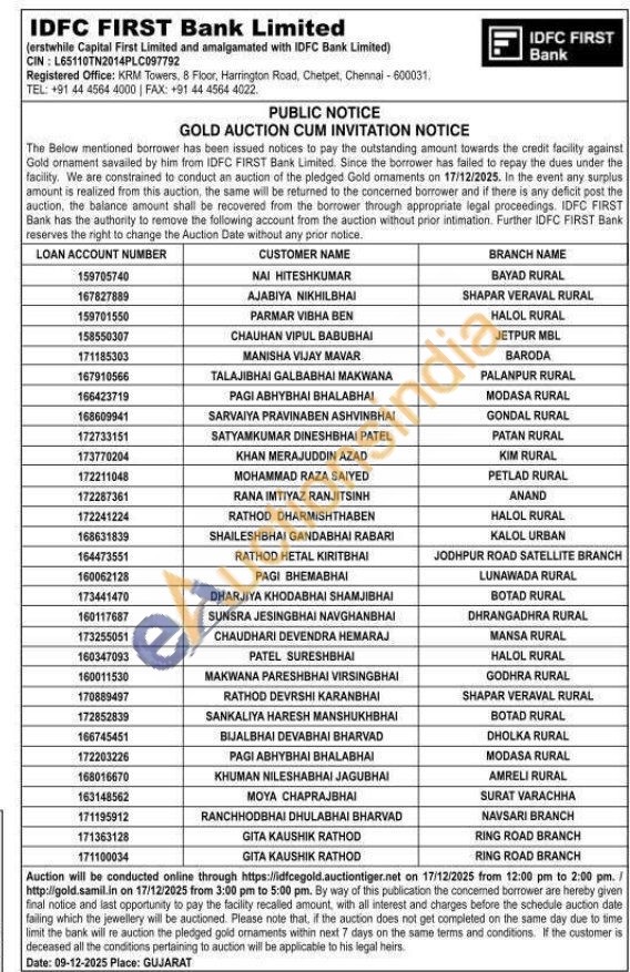 IDFC First Bank Ltd Gold Auctions Auction in Chennai