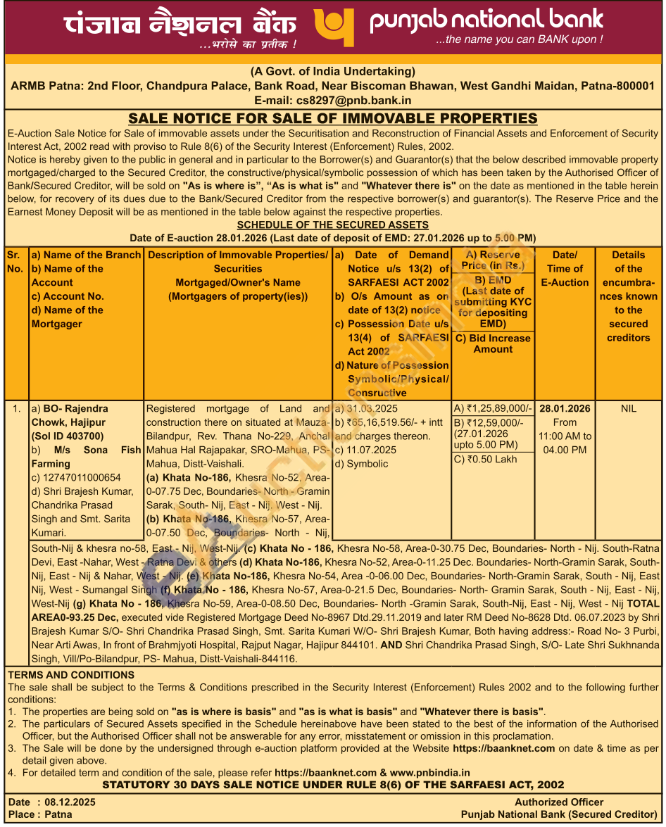 Registered mortgage of Land and construction there on situated at Mauza-Bilandpur, Rev. Thana No-229, Anchal Mahua Hal Rajapakar, SRO-Mahua, PS-Mahua, Distt-Vaishali. a) Khata No-186, Khesra No-52, Area-0-07.75 Dec, Boundaries-North - Gramin Sarak, South- Nij, East - Nij. West - Nij. (b) Khata No-186, Khesra No-57, Area-0-07.50 Dec, Boundaries- North Nij South-Nij & khesra no-58, East - Nij, West-Nij. (c) Khata No 186, Khesra No-58, Area-0-30.75 Dec, Boundaries- North - Nij. South-Ratna Devi, East-Nahar, West - Ratna Devi & others (d) Khata No-186, Khesra No-52, Area-0-11.25 Dec. Boundaries- North-Gramin Sarak, South-Nij, East - Nij & Nahar, West - Nij. (e) Khata No-186, Khesra No-54, Area -0-06.00 Dec, Boundaries- North-Gramin Sarak, South - Nij, East Nij, West - Sumangal Singh (f) Khata No 186, Khesra No-57, Area-0-21.5 Dec, Boundaries- North- Gramin Sarak, South - Nij, East Nij. West-Nij (g) Khata No 186, Khesra No-59, Area-0-08.50 Dec, Boundaries- North -Gramin Sarak, South-Nij, East - Nij, West - Nij TOTAL AREA0-93.25 Dec, executed vide Registered Mortgage Deed No-8967 Dtd.29.11.2019 and later RM Deed No-8628 Dtd. 06.07.2023 by Shri Brajesh Kumar S/O- Shri Chandrika Prasad Singh, Smt. Sarita Kumari W/O- Shri Brajesh Kumar, Both having address:- Road No- 3 Purbi, Near Arti Awas, In front of Brahmjyoti Hospital, Rajput Nagar, Hajipur 844101. AND Shri Chandrika Prasad Singh, S/O- Late Shri Sukhnanda Singh, Vill/Po-Bilandpur, PS- Mahua, Distt-Vaishali-844116