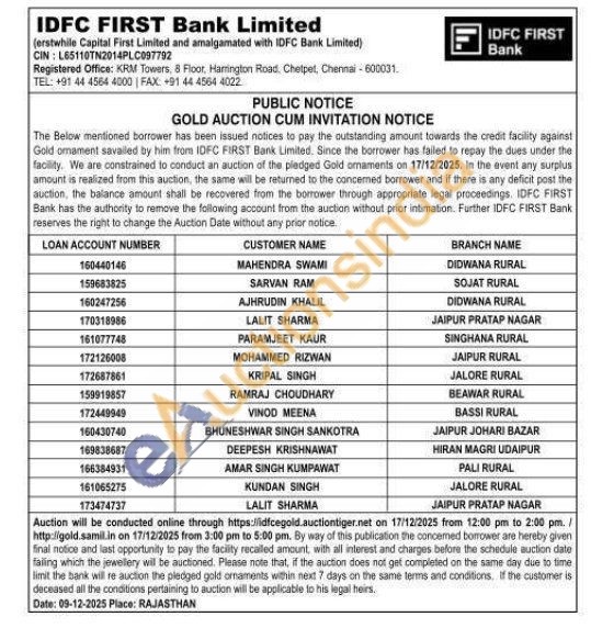 IDFC First Bank Ltd Gold Auctions Auction in Jaipur