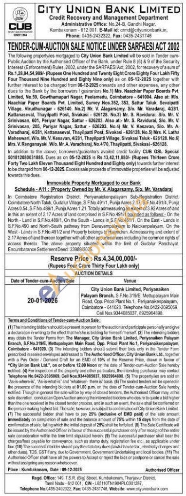 In Coimbatore Registration District, Periyanaickenpalayam Sub-Registration District, Coimbatore North Taluk, Gudalur Village, S.F.No 491/1, Punja Acres 2.17. S.F.No.491/4, Punja Acres 0.54, S.F.No 489/1, Punja Acres 1.21. Totally admeasuring an extent of 3.92 Acres of land in this an extent of 2.17 Acres of land comprised in S.F.No 491/1 bounded as follows:: On the North-Land in S.F.No.489/1, On the South-Lands in S.F.No.461/1, On the East-Lands in S.F.No 490 and North-South pathway from Devayampalayam to Naickenpalayam, On the West Lands in S.F.No.491/2 and Property belongs to Rajendran. Admeasuring and extent of 2.17 Acres of land thereon together with all other appurtenances including the common rights of access thereto. The above property situated within the limit of Gudalur Panchayat. Encumbarance Settlement Deed: 23989/2025