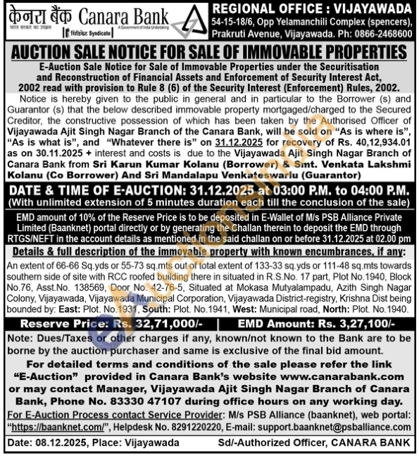 An extent of 66-66 Sq.yds or 55-73 sq.mts out of total extent of 133-33 sq. yds or 111-48 sq.mts towards southern side of site with RCC roofed building there in situated in R.S.No. 17 part, Plot No. 1940, Block No.76, Asst.No. 138569, Door No. 42-76-5, Situated at Mokasa Mutyalampadu, Azith Singh Nagar Colony, Vijayawada, Vijayawada Municipal Corporation, Vijayawada District-registry, Krishna Dist being bounded by: East: Plot. No. 1931, South: Plot. No. 1941, West: Municipal road, North: Plot. No. 1940