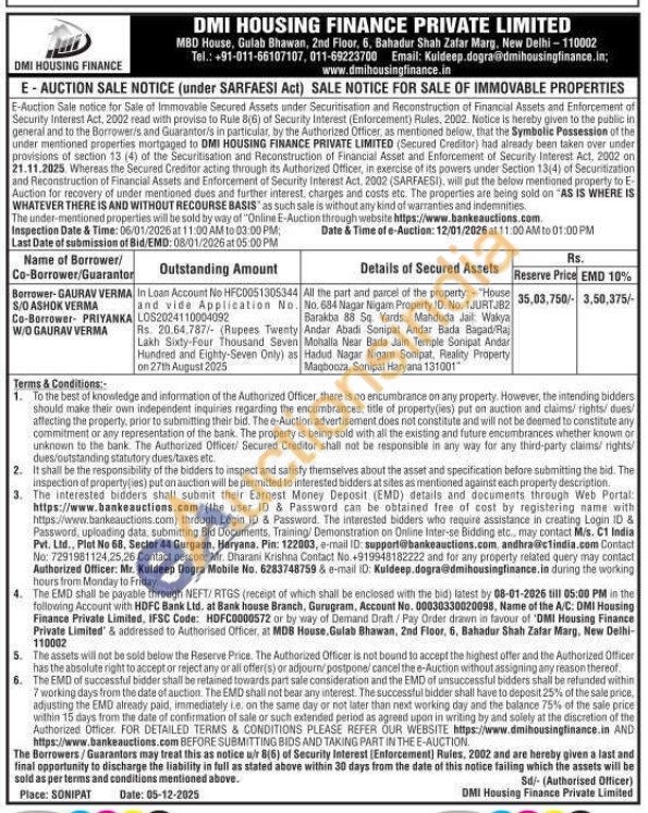 All the part and parcel of the property: House No. 684 Nagar Nigam Property ID. No. 1JURTJB2 Barakba 88 Sq. Yards, Mahduda Jail: Wakya Andar Abadi Sonipat Andar Bada Bagad/Raj Mohalla Near Bada Jain Temple Sonipat Andar Hadud Nagar Nigam Sonipat, Reality Property Maqbooza, Sonipat Haryana 131001"