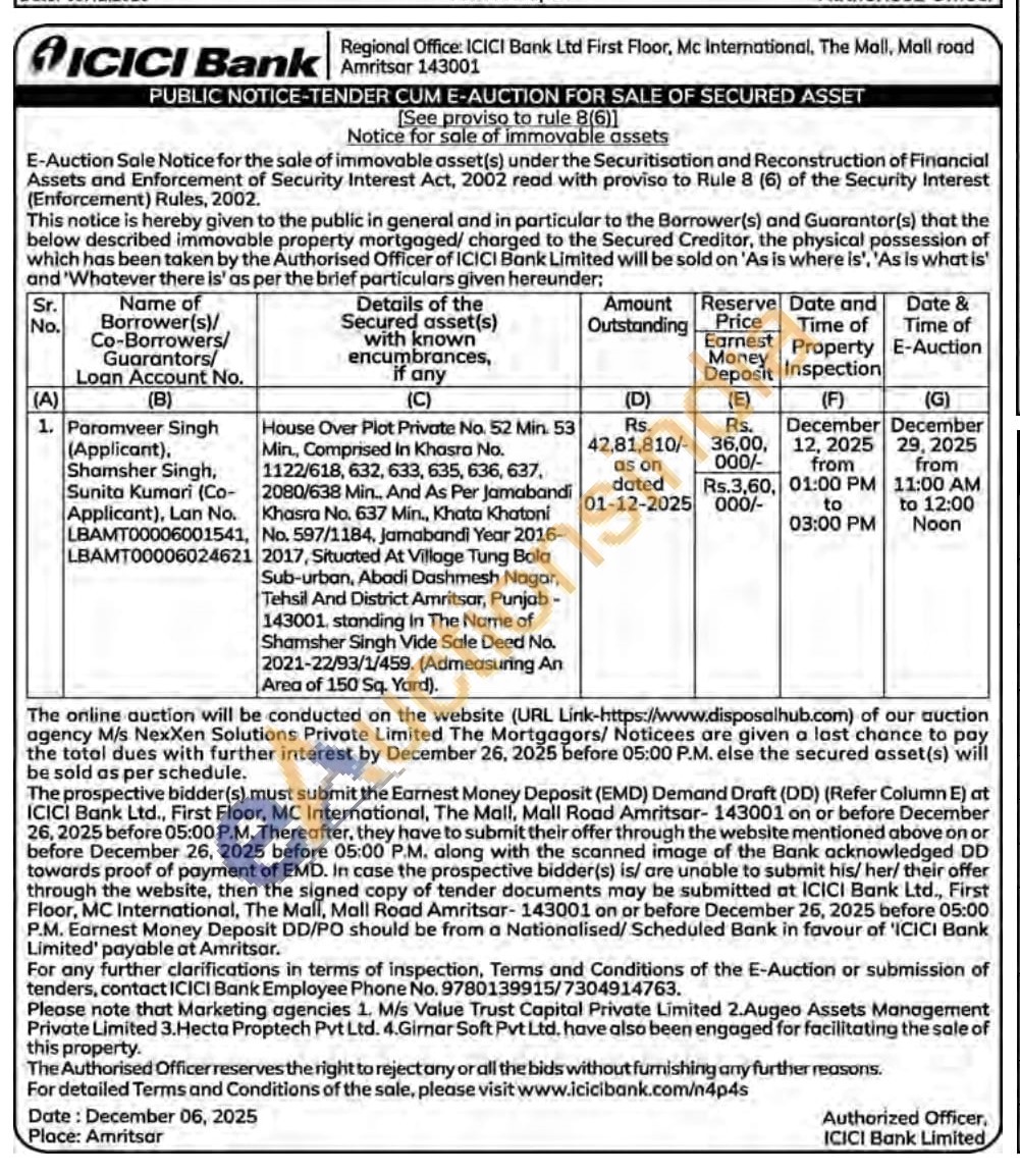 House Over Plot Private No. 52 Min. 53 Min., Comprised In Khasra No. 1122/618, 632, 633, 635, 636, 637, 2080/638 Min., And As Per Jamabandi Khasra No. 637 Min., Khata Khatoni No. 597/1184, Jamabandi Year 2016-2017, Situated At Village Tung Bala Sub-urban, Abadi Dashmesh Nagar, Tehsil And District Amritsar, Punjab 143001, standing in The Name of Shamsher Singh Vide Sale Deed No. 2021-22/93/1/459. (Admeasuring An Area of 150 Sq. Yard