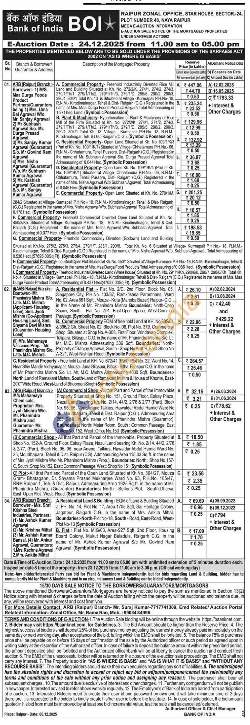 C. Residential Property:- Free hold Land at KH. No. 672/41 (Part), Plot No. 22, Ward No. 14, Near Shiv Mandir Vidhyanagar, Mouza-Juna Bilaspur, Block-Bilha, Bilaspur C.G. in the name of Mr. Phanindra Mishra S/o. Lt. Mr. M.C. Mishra Admeasuring 4000 Sqft. Boundaries:-North:Land of Ramakant Mishra, South-Land of Ramakant Mishra & House of Khonte, East-20'0" Wide Road, West-Land of Bhooman Singh (Symbolic Possession)