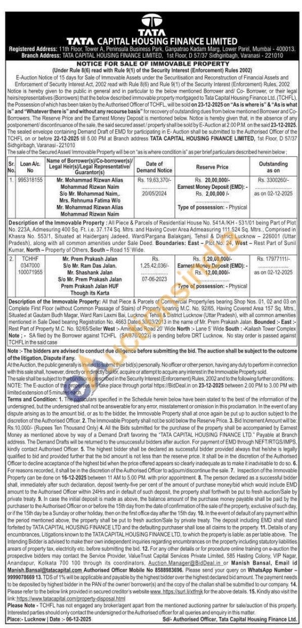 Description of the Immovable Property: All that Piece & Parcels of Commercial Propertyñes bearing Shop Nos. 01, 02 and 03 on Complete First Floor (without Common Passage of Stairs) of Property bearing M.C. No. 92/65, Having Covered Area 157 Sq. Mtrs, Situated at Gautam Budh Magar, Ward Rani Laxmi Bai, Lucknow, Tehsil & District Lucknow (Uttar Pradesh), with all common amenities mentioned in Sale Deed bearing Registration No. 4663 Dated 30/03/2013 in the name of Mr. Prem Prakash Jalan. Bounded:- East: Rest Part of Property M.C. No. 92/65/Seller West:-Aminabad Road 20° Wide North: Lane 5' Wide South: Kailash Tower Complex Note: SA filed by the Borrower against TCHFL (SA/876/2023) is pending before DRT Lucknow. No stay order is passed against TCHFL in the said case