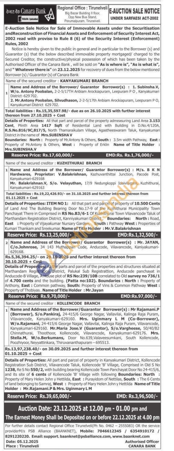 Details of Properties: All the parts and parcel of the properties and structures situated at Marthandam Registration District, Palukal Sub Registrattion, Anducode panchayat in Anducode-B Village, A House plot of RS No:239/10B correlated to Old survey no 736/1 of 4.700 cents and the building. (Patta no:102). Boundaries: North: Property of Anthony, East: Common pathway, South: Property of Vins & Common Pathway West: Property of Thobiyas. Name of Title Holder: Mr.Jayan