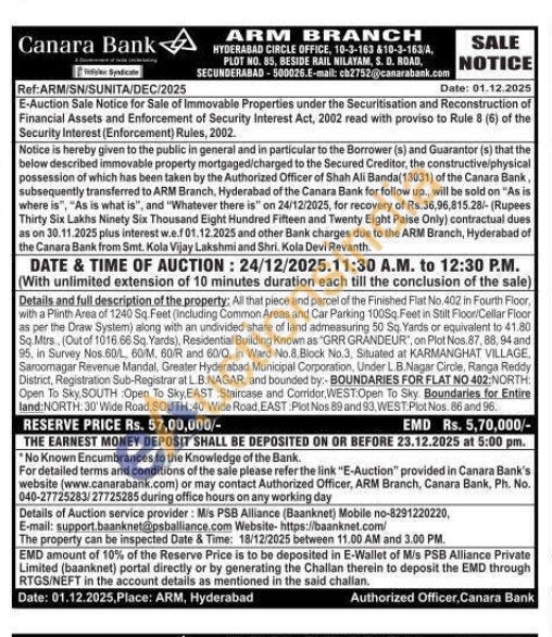 Details and full description of the property: All that piece and parcel of the Finished Flat No. 402 in Fourth Floor, with a Plinth Area of 1240 Sq. Feet (including Common Areas and Car Parking 100Sq. Feet in Stilt Floor/Cellar Floor as per the Draw System) along with an undivided share of land admeasuring 50 Sq. Yards or equivalent to 41.80 Sq. Mtrs (Out of 1016.66 Sq. Yards), Residential Building Known as "GRR GRANDEUR", on Plot Nos 87, 88, 94 and 95, in Survey Nos.60/L 60/M, 60/R and 60/Q, in Ward No.8, Block No.3, Situated at KARMANGHAT VILLAGE, Saroomagar Revenue Mandal, Greater Hyderabad Municipal Corporation, Under L.B. Nagar Circle, Ranga Reddy District, Registration Sub-Registrar at L.B.NAGAR, and bounded by:- BOUNDARIES FOR FLAT NO 402:NORTH: Open To Sky, SOUTH : Open To Sky, EAST Staircase and Corridor, WEST:Open To Sky Boundaries for Entire land:NORTH: 30' Wide Road, SOUTH:40 Wide Road, EAST: Plot Nos 89 and 93, WEST Plot Nos. 86 and 96