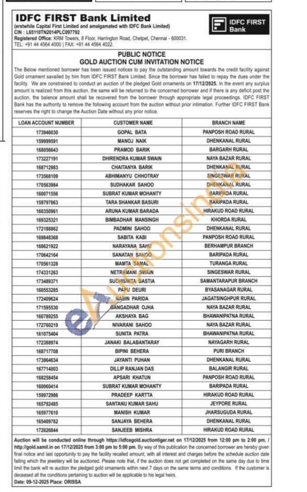 IDFC First Bank Ltd Gold Auctions Auction in Chennai