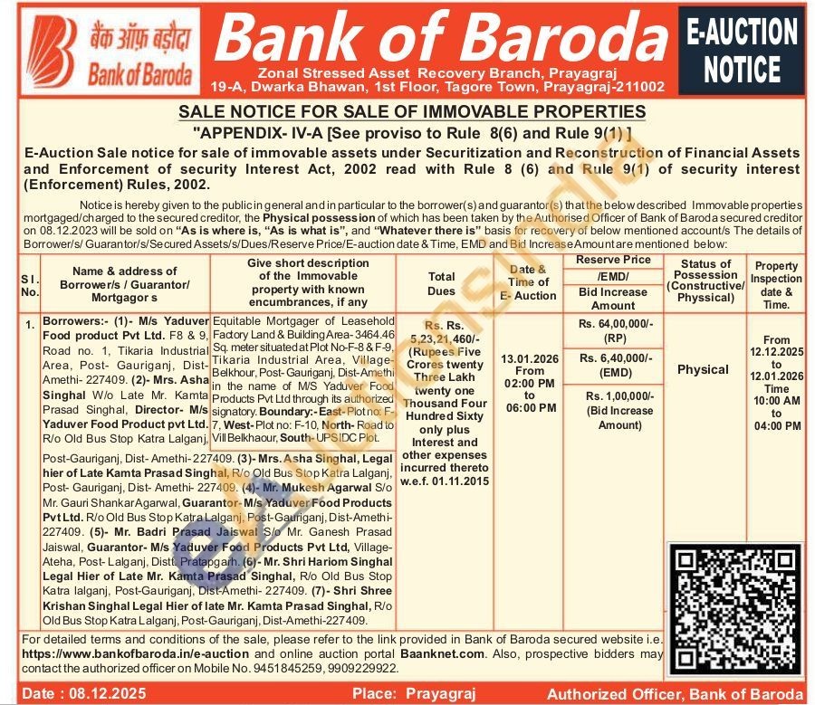 Equitable Mortgager of Leasehold Factory Land & Building Area-3464.46 Sq. meter situated at Plot No-F-8 & F-9, Tikaria Industrial Area, Village-Belkhour, Post-Gauriganj, Dist-Amethi in the name of M/S Yaduver Food Products Pvt Ltd through its authorized signatory. Boundary:-East-Plotno: F-. 7, West-Plot no: F-10, North- Road to , Vill Belkhaour, South-UPS IDC Plot.