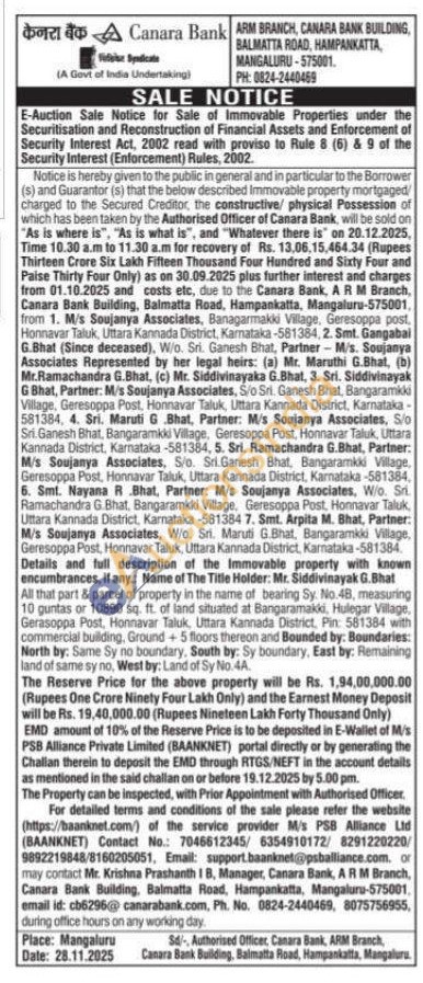 All that part & parcel of property in the name of bearing Sy. No. 48, measuring 10 guntas or 10890 sq. ft. of land situated at Bangaramakki, Hulegar Village, Gerasoppa Post, Honnavar Taluk, Uttara Kannada District, Pin: 581384 with commercial building, Ground + 5 floors thereon and Bounded by: Boundaries: North by: Same Sy no boundary, South by: Sy boundary, East by: Remaining land of same sy no, West by: Land of Sy No.4A
