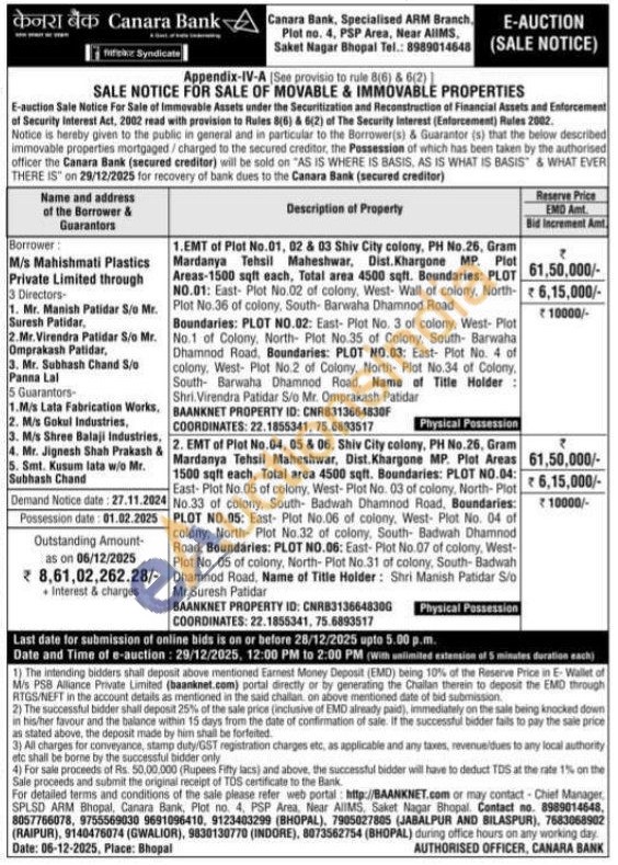 1.EMT of Plot No.01, 02 & 03 Shiv City colony, PH No.26, Gram Mardanya Tehsil Maheshwar, Dist. Khargone MP. Plot Areas-1500 sqft each, Total area 4500 sqft. Boundaries: PLOT NO.01: East- Plot No.02 of colony. West-Wall of colony, North Plot No.36 of colony, South-Barwaha Dhamnod Road