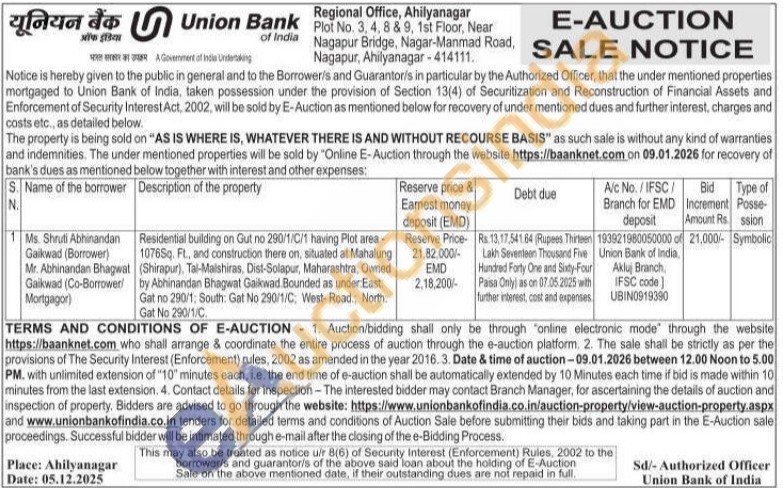 Residential building on Gut no 290/1/C/1 having Plot area -1076Sq. Ft., and construction there on, situated at Mahalung (Shirapur), Tal-Malshiras, Dist-Solapur, Maharashtra, Owned by Abhinandan Bhagwat Gaikwad Bounded as under East: Gat no 290/1, South: Gat No 290/1/C: West-Road., North: Gat No 290/1/C