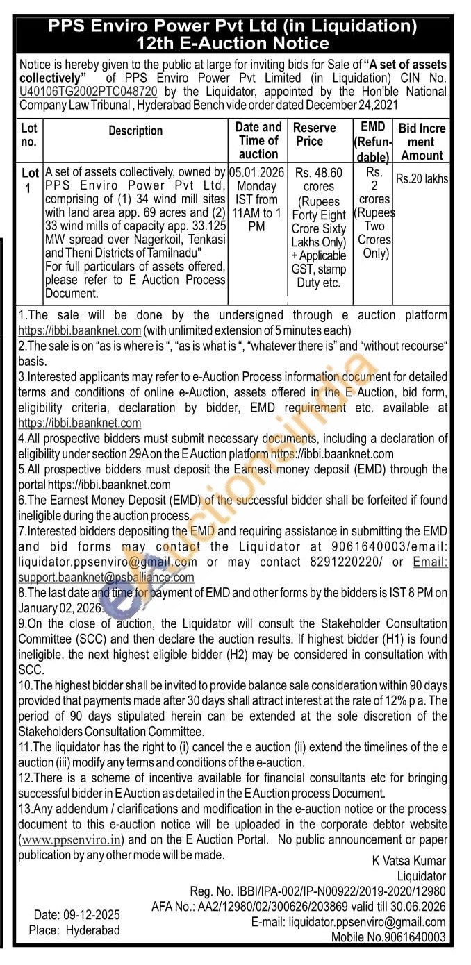 A set of assets collectively, owned by PPS Enviro Power Pvt Ltd, comprising of (1) 34 wind mill sites with land area app. 69 acres and (2) 33 wind mills of capacity app. 33.125 MW spread over Nagerkoil, Tenkasi and Theni Districts of Tamilnadu" For full particulars of assets offered, please refer to E Auction Process Document.