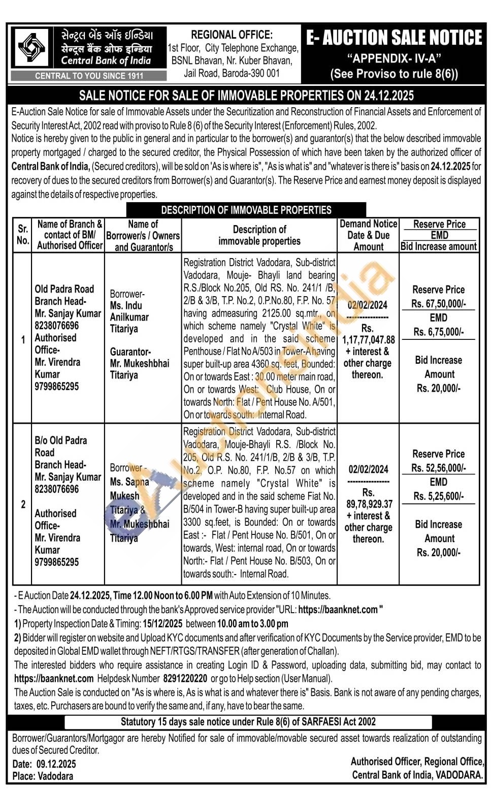 Registration District Vadodara, Sub-district Vadodara, Mouje- Bhayli land bearing R.S./Block No.205. Old RS. No. 241/1 /B. 2/B & 3/B, T.P. No.2, 0.P.No.80, F.P. No. 57 having admeasuring 2125.00 sq.mtr., on which scheme namely "Crystal White" is developed and in the said scheme Penthouse/Flat No A/503 in Tower-Ahaving super built-up area 4360 sq. feet, Bounded: On or towards East: 30.00 meter main road, On or towards West: Club House. On or towards North: Flat/ Pent House No. A/501, On or towards south: Internal Road.