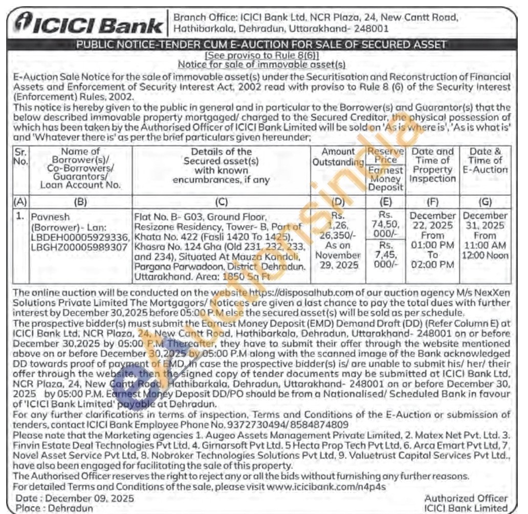 Flat No. B-G03, Ground Floor, Resizone Residency, Tower- B, Part of Khata No. 422 (Fasli 1420 To 1425). Khasra No. 124 Gha (Old 231, 232, 233, and 234), Situated At Mauza Kandoli, Pargana Parwadoon, District Dehradun